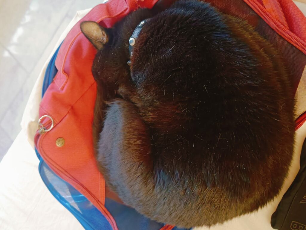 - des copies de nos passeports et visa, ainsi que des photos d’identité. Lesdits passeports incluant celui du chat (l’original pour le coup). Sa cage et les divers accessoires du type harnais, gamelle d’eau, un ptit sac de croquettes, les médicaments destinés à la calmer en cas de gros stress et des tapis absorbants pour le fond de la cage restant également à proximité du grab bag.